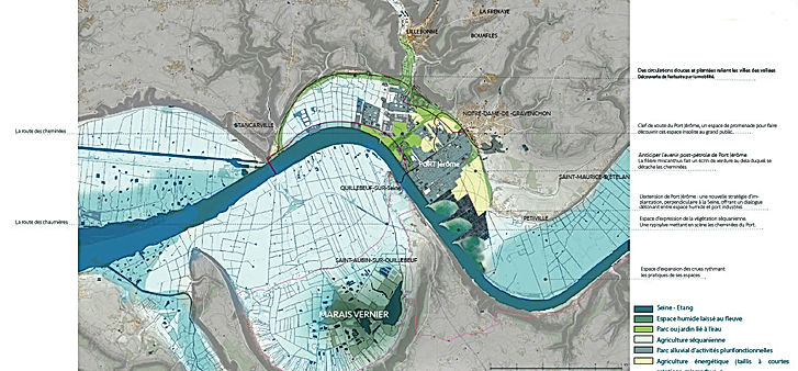 C’est avec trois autres paysagistes, Marie, Andréas et Elie, que nous avons réalisé cette étude en partenariat avec le CPIER, Contrat de Plan Interregional Etat-Région Vallée de la Seine. Nous avons questionné, projeté et posé une réflexion de paysage à très grande échelle sur un territoire aussi vaste que complexe : la Vallée de la Seine.